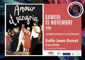 Un bar à tapas comme toile de fond et nous voilà plongés dans les situations des couples qui le traversent. Petites annonces, premier rendez-vous, amour maternel, rencontre avec son ex… 13 scènes d’amour qui se succèdent et qui sont l’occasion pour les comédiens de s’amuser avec les codes des différentes manières d’aimer ! La Sangria étant le fil conducteur de la pièce et offerte en fin de représentation ! De nombreuses chansons illustrent cette balade amoureuse où chaque changement de décor et de costumes sont à vue du spectateur…